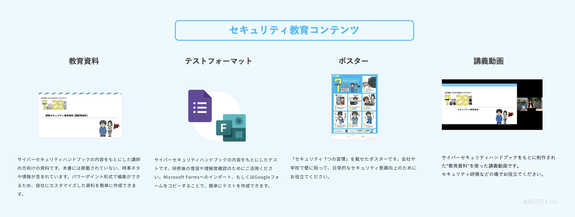 MOTEXが推進する『NO MORE 情報漏洩 2050』プロジェクトは、今後もセキュリティ教育の普及と標準化を通じて、企業・組織におけるセキュリティリテラシーの向上に貢献してまいります。